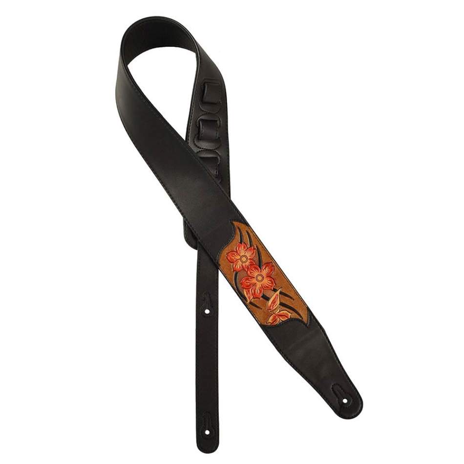 Popruh na gitaru, kožený, motív červených kvetov, čierna farba