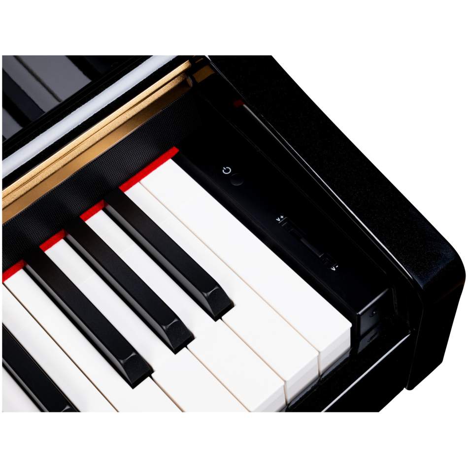 Konektivita ďalej zahŕňa USB to Host, MIDI In/Out a Audio In/Out. Pevná konštrukcia s lesklým povrchom pripomína tradičné akustické piana a zároveň pôsobí ako elegantný kus nábytku.