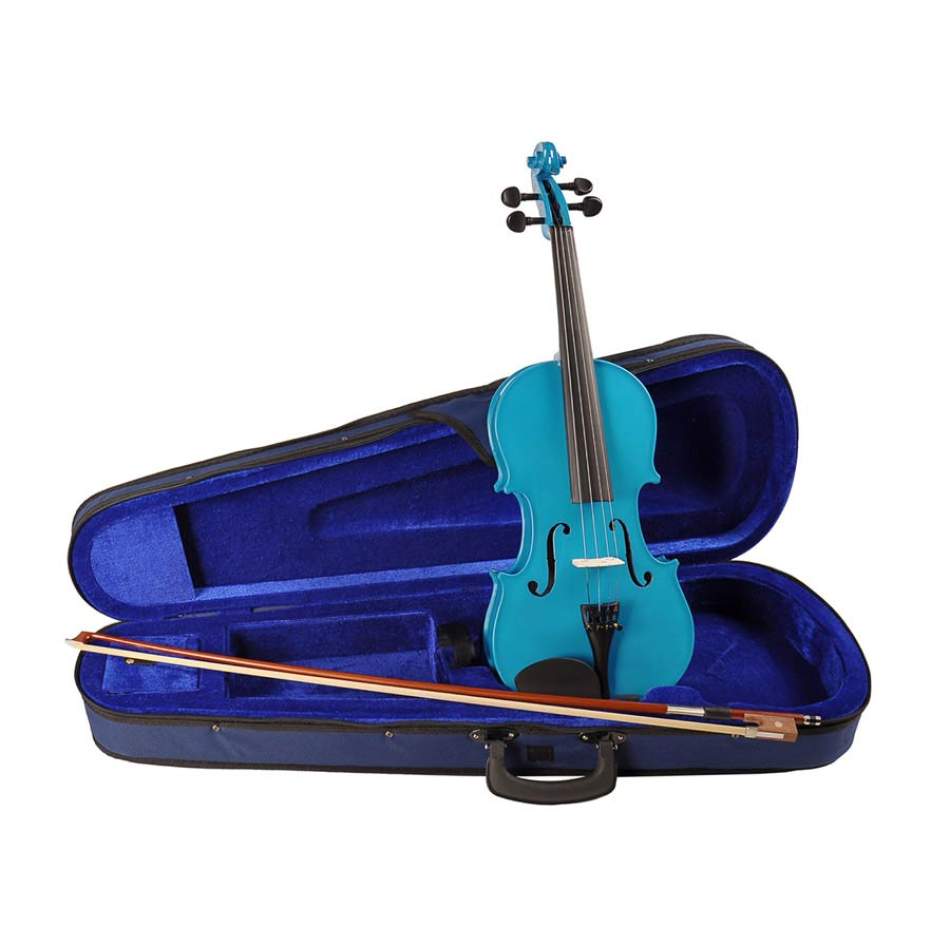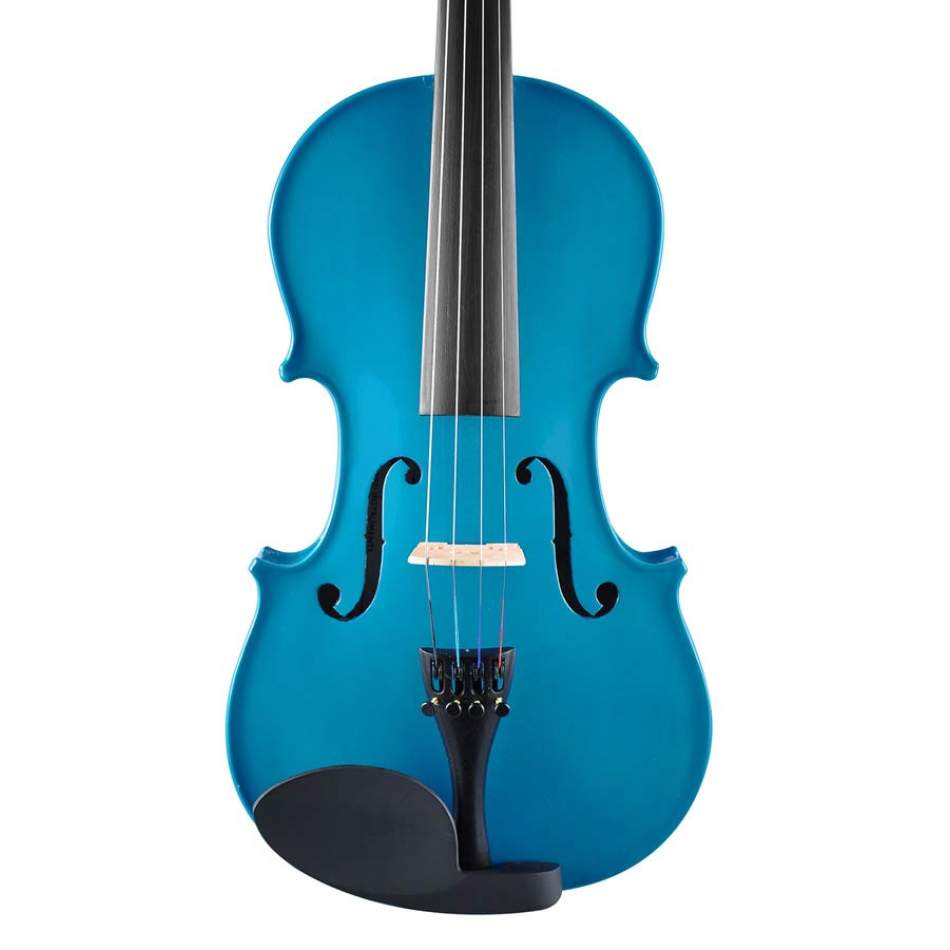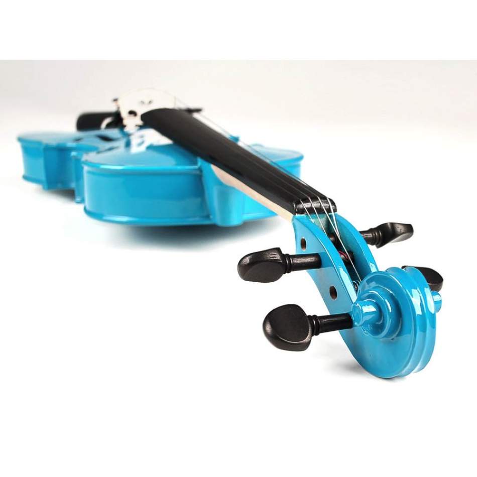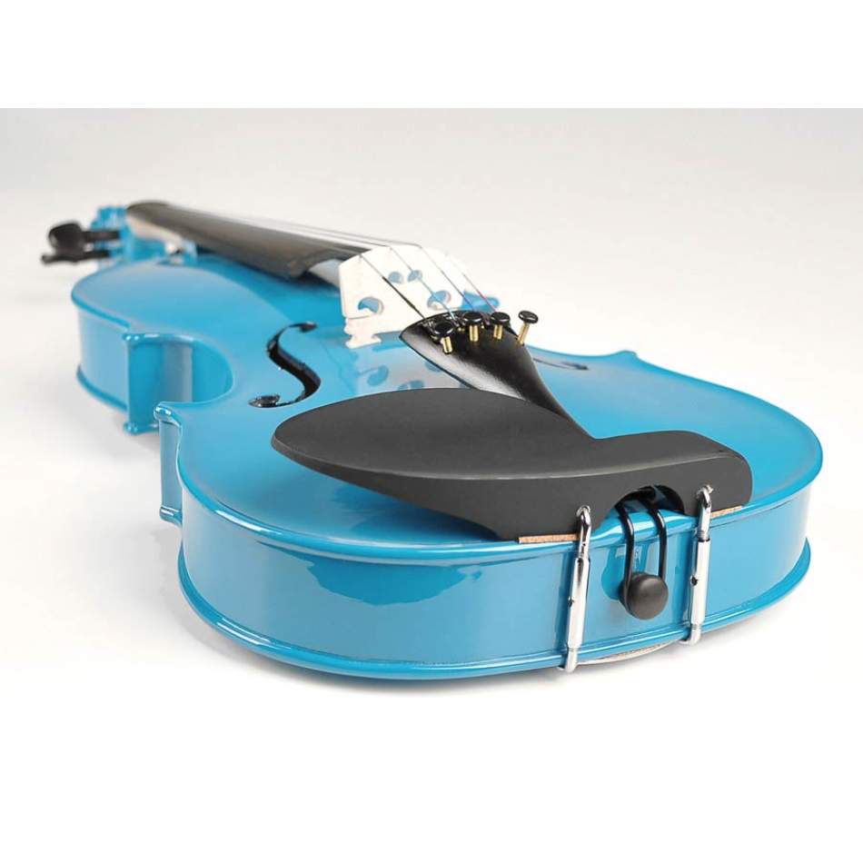 Husľová sada, 3/4 veľkosť, hmatník, podbradník a ladiace kolíky sú z ebonizovaného tvrdého dreva, strunník je vybavený jemnými dolaďovačmi, modrý lak