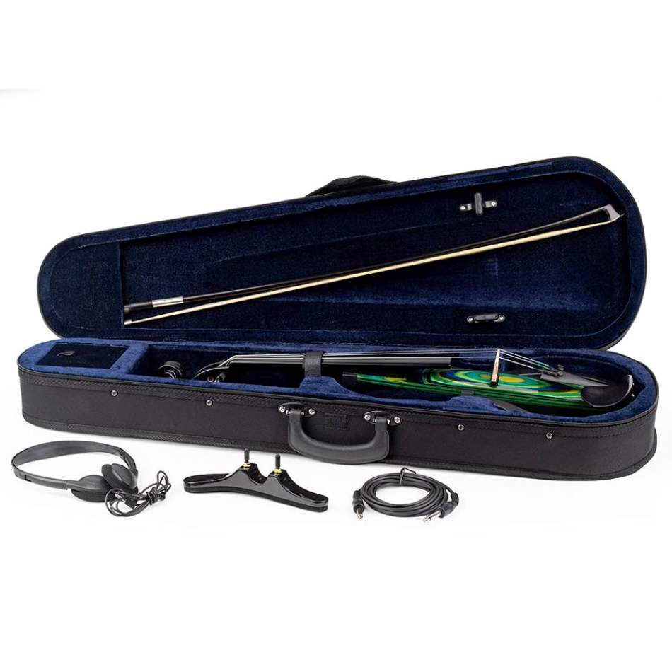 Elektrické husle, moderný dizajn, Shadow aktívny snímač, s púzdrom, šláčikom, slúchadlami a ramennou opierkou, farebné prevedenie: zelené