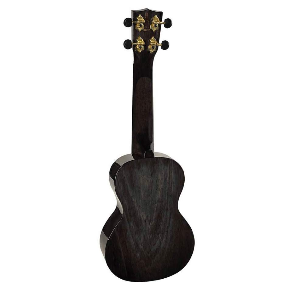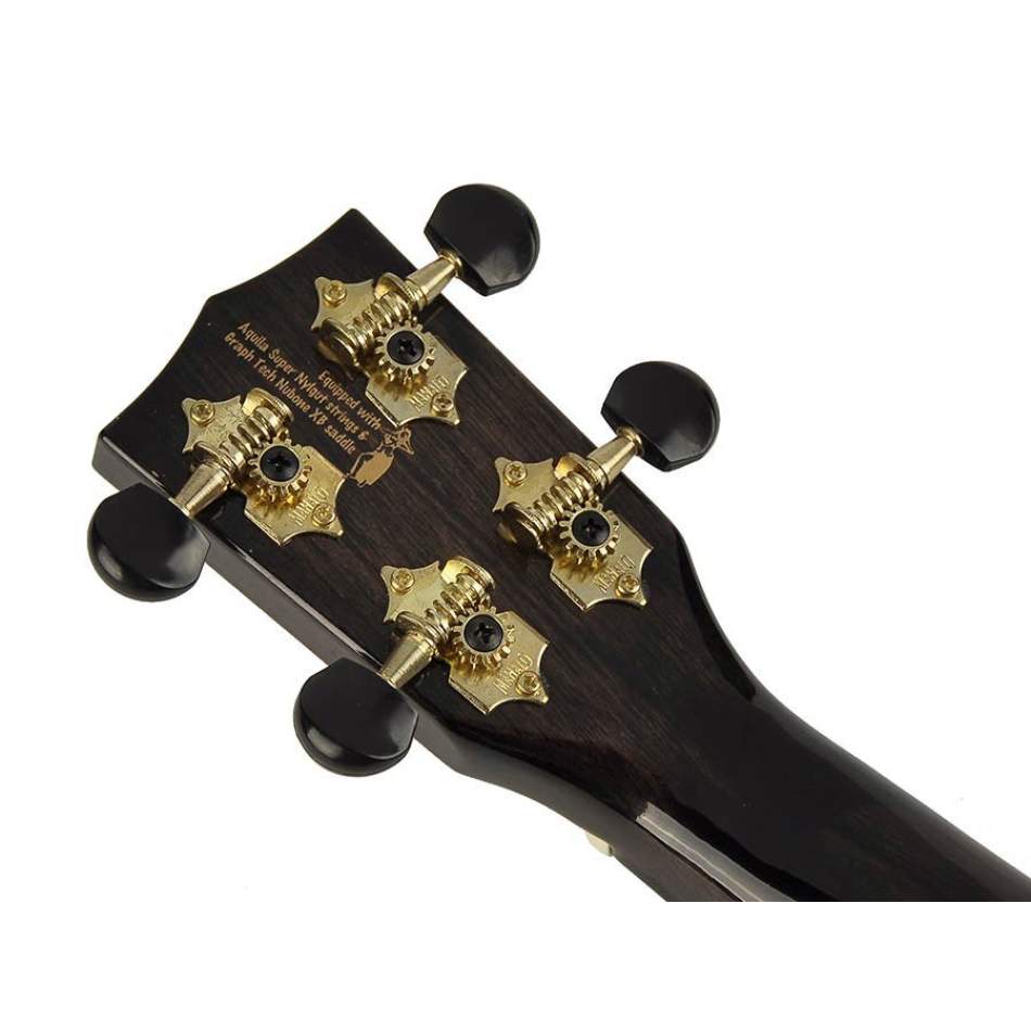 Koncertné ukulele, 40 mm šírka krku, čierna Špecifikácia: Typ: koncertné Telo: sengon s klenutou zadnou doskou Krk: sengon Hmatník: mahagón Kobylka: mahagón Ladiace kolíky: vintage, pozlátené Struny: Aquila 16 Pražcov: nikel Sedlo: nubone Príslušenstvo: s púzdrom