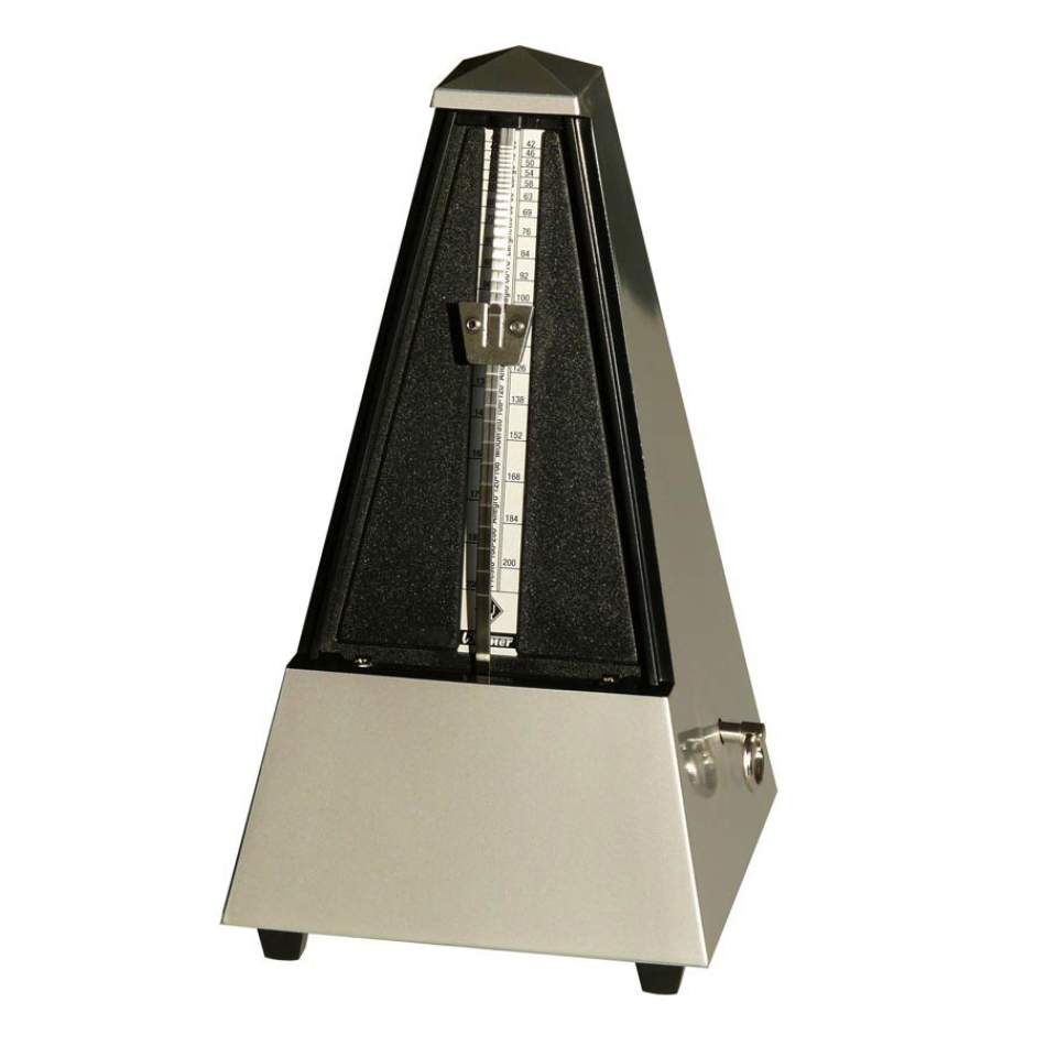 Metronóm, pyramídový tvar, plastový kryt, bez zvončeka, svetlá strieborná